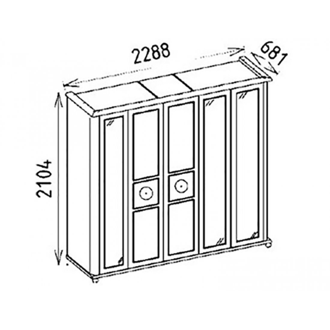 Пятидверный платяной шкаф Mistral от Bellona. Три зеркальные двери по краям, и две двери с золотой отделкой, металлическими ручками в виде петли в центре. Шкаф вместительный, по высоте подходит для большинства помещений, глубина 68 см - позволит удобно разместить вешалки с одеждой. Наполнение шкафа – два широких отделения с вешалками и полками, одно узкое отделение с 2 полками и штангой. Двери с доводчиками, обеспечивающими плавный ход и безопасность. Шкаф изготовлен из высококачественного ЛДСП производства Турция, класс эмиссии формальдегидов Е1.